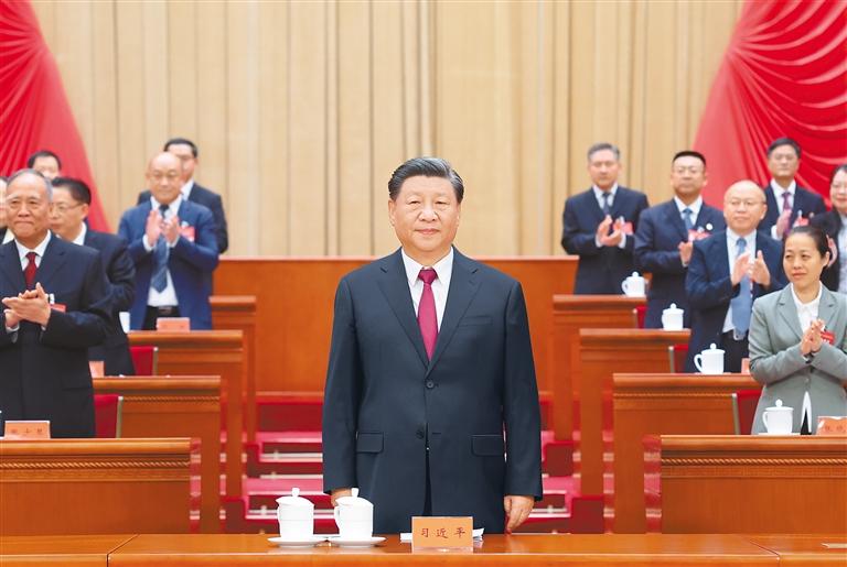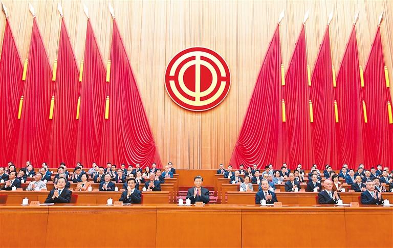 10月9日,中国工会第十八次全国代表大会在北京人民大会堂开幕。习近平、赵乐际、王沪宁、蔡奇、丁薛祥、李希等在主席台就座,祝贺大会召开。新华社记者 申宏 摄