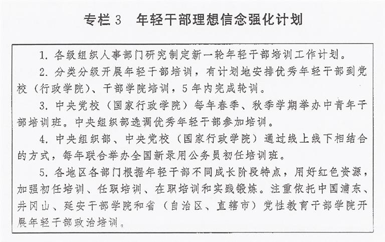 (三)加强年轻干部政治训练。强化习近平新时代中国特色社会主义思想学习教育,突出政治忠诚教育、理想信念教育、纪律规矩教育,加强优良传统作风和责任感使命感教育,强化斗争意识,综合运用理论讲授、政策解读、案例教学、现场体验等方式开展系统培训。党委(党组)负责同志要讲好“开班第一课”。安排思想政治素质过硬、理论水平较高、实践经验丰富的领导干部上讲台授课。探索推行“政治辅导员”、“导师帮带”制度。通过开展党性分析、实践锻炼、过“政治生日”、重温入党誓词等方式,锤炼党性修养、提高政治觉悟。实施年轻干部理想信念强化计划(专栏3)。