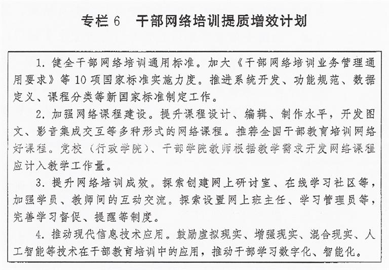 (二)加强网络培训课程建设。鼓励党校(行政学院)、干部学院和部门、企业、高校等组织开发精品网络课程。注重把握网络教学特点和规律,改进授课方式,提高制作水平,丰富呈现形式,提升课程质量。严把网络课程政治关、质量关,规范讲授、制作、审核、发布和更新、退出流程。充分发挥网络培训优势,推动优质资源下基层。用好网络直播培训形式,增强现场体验感。实施干部网络培训提质增效计划(专栏6)。