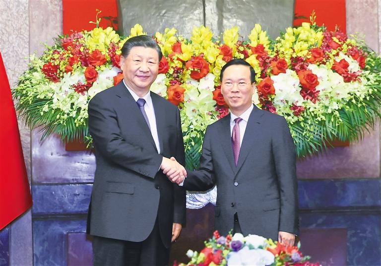 当地时间12月13日上午,中共中央总书记、国家主席习近平在河内主席府同越南国家主席武文赏举行会谈。