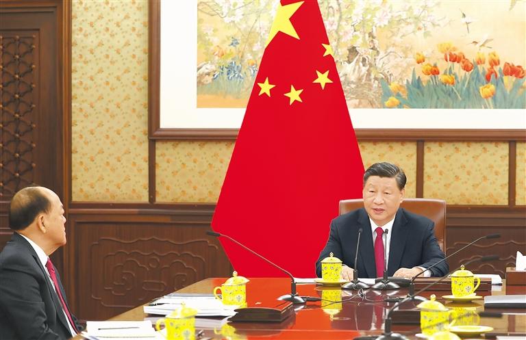 习近平强调,新时代新征程,我们正以中国式现代化全面推进强国建设、民族复兴伟业。中央将一如既往全面准确、坚定不移贯彻“一国两制”方针,全面落实“爱国者治澳”原则,全力支持行政长官和特别行政区政府团结带领社会各界,抓住国家发展带来的历史机遇,不断推进具有澳门特色的“一国两制”成功实践,以新的发展成果迎接澳门回归祖国25周年。