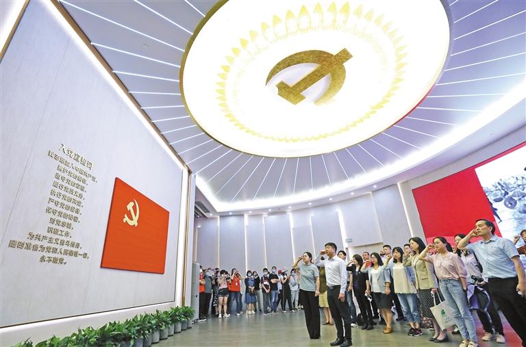图为党员在上海中共一大纪念馆里重温入党誓词。 新华社记者 刘颖 摄