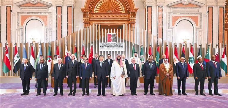 当地时间12月9日下午,首届中国-阿拉伯国家峰会在沙特首都利雅得阿卜杜勒阿齐兹国王国际会议中心举行。国家主席习近平和沙特王储兼首相穆罕默德、埃及总统塞西、约旦国王阿卜杜拉二世、巴林国王哈马德、科威特王储米沙勒、突尼斯总统赛义德、吉布提总统盖莱、巴勒斯坦总统阿巴斯、卡塔尔埃米尔塔米姆、科摩罗总统阿扎利、毛里塔尼亚总统加兹瓦尼、伊拉克总理苏达尼、摩洛哥首相阿赫努什、阿尔及利亚总理阿卜杜拉赫曼、黎巴嫩总理米卡提等21个阿盟国家领导人以及阿拉伯国家联盟秘书长盖特等国际组织负责人出席峰会。 习近平在会上发表题为《弘扬中阿友好精神 携手构建面向新时代的中阿命运共同体》的主旨讲话。新华社记者 谢环驰 摄