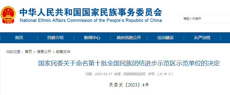 国家民委关于命名第十批全国民族团结进步示范区示范单位的决定