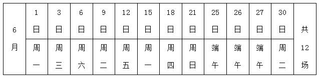 6月场次:6月1日、3日、6日、9日、12日、15日、18日、21日、25日、26日、27日、30日各1场。