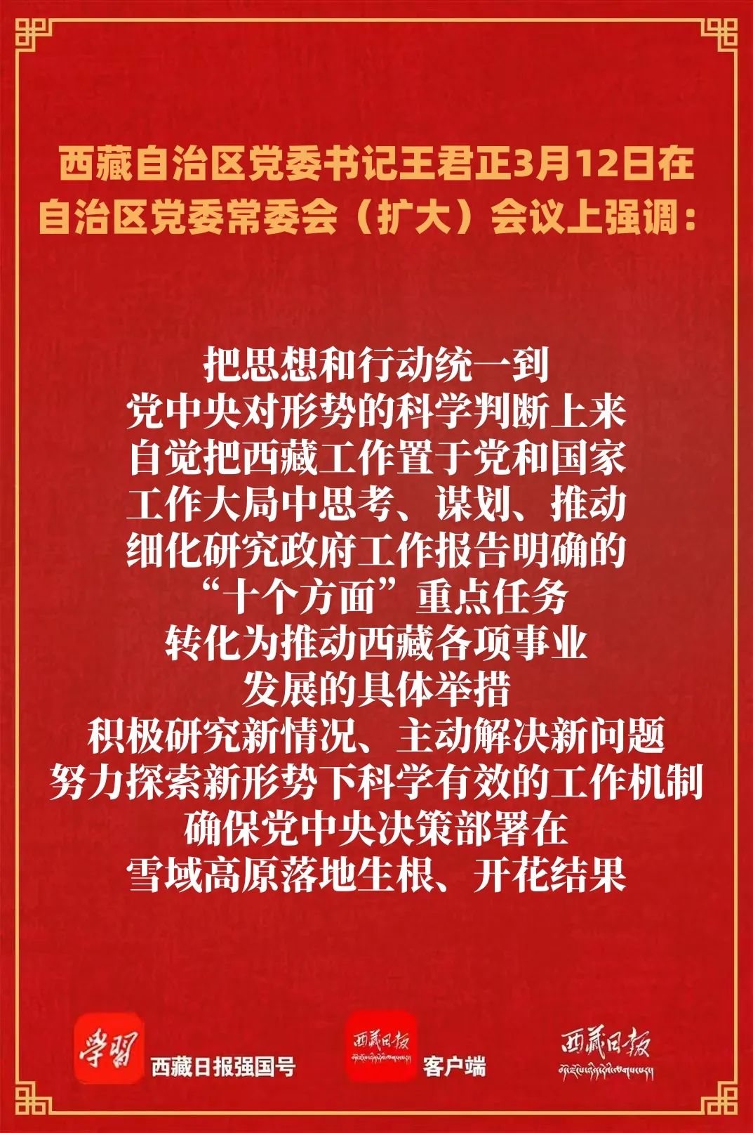 王君正强调,要弘扬理论联系实际的学风,紧密结合实际抓好全国两会精神贯彻落实,努力建设社会主义现代化新西藏。把贯彻落实全国两会精神与贯彻落实习近平总书记关于西藏工作的重要指示和新时代党的治藏方略结合起来,持之以恒抓好“稳定、发展、生态、强边”四件大事落实,坚决维护社会大局持续稳定,坚持全面依法治藏,以科学化机制和常态化、法治化理念,把维稳工作做在日常、做到经常、落实到基层,推进中华民族共同体建设,深化拓展“国家意识、公民意识、法治意识”教育,推进藏传佛教中国化,不断打牢长治久安的基础;努力推动西藏经济社会高质量发展,因地制宜发展新质生产力,培育壮大清洁能源、低空经济等战略性新兴产业,加快构建具有西藏特色的现代化产业体系,抓住新时代国家推进西部大开发重大机遇,积极推进西藏融入成渝地区双城经济圈,确保经济发展当前有活力、未来有潜力;不断改善民生凝聚人心,坚持以人民为中心的发展思想,把群众身边的小事当作各级党委、政府的大事来抓,巩固拓展脱贫攻坚成果,全面推进乡村振兴,千方百计增加农牧民群众收入,解决好事关西藏经济社会高质量发展的深层次问题,科学有序推进定日地震灾后恢复重建,切实增强各族群众的获得感幸福感安全感;扎实筑牢国家生态安全屏障,严格落实青藏高原生态保护法,科学实施南北山绿化工程,加快建设美丽西藏;持续加强边疆地区建设,强化基本公共服务,确保边防巩固、边境安全、边民幸福。