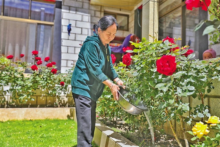 图为其美卓嘎在自家院子里浇花。记者 唐启胜 摄
