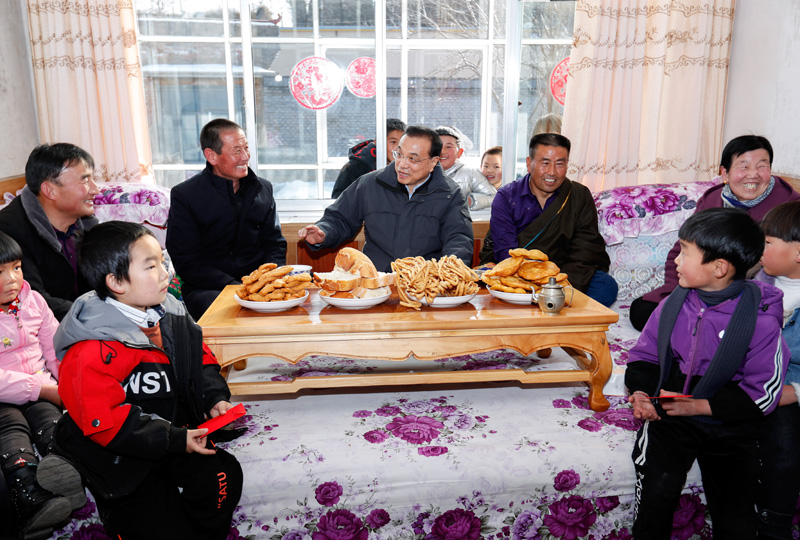 1月21日下午,李克强带着上午考察集市选购的年货,来到西宁市湟中区上新庄镇黑城村,看望慰问当地群众。这里曾经是贫困村,如今已实现贫困人口全部脱贫。踩着积雪,总理接连走访了两家农户。藏族村民李志成为总理献上哈达,并端上热腾腾的奶茶和香喷喷的馓子。总理尝了一口主人端上的青稞酒说:“挺香的。”屋里的炕头上,总理与春节回家过年的农民工和大学生围坐在一起拉家常,一一询问他们在哪儿打工、收入多少、与种地收入相比差多少,以及大学生未来就业意向等。农民工告诉总理,他们大都在西宁打工,收入远高于种地收入,非常希望西宁发展得更好更快。总理对随行人员说,一直以来,打工收入都是农民家庭的主要收入来源,加快推进新型城镇化可以为农民创造更多更稳定的打工机会,不断增加农民收入。让大家稳稳当当走向富裕不再返贫。