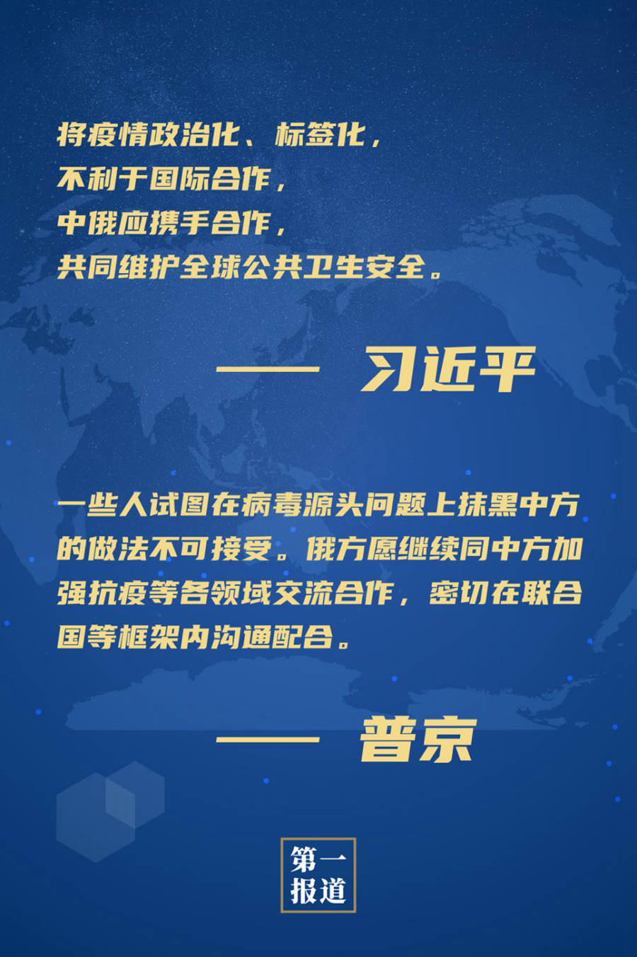 习近平强调,中俄山水相连,两国人民心心相通。俄方在中方抗击疫情最艰难时刻鼎力相助,我们铭记在心。这几天,中国政府派出的医疗专家组正在莫斯科积极开展工作,同俄方交流分享抗疫经验。中方已经向俄方提供了一批援助,并积极协助俄方在华采购抗疫医疗物资。中方将继续给予俄方坚定支持。感谢俄方为在俄中国公民所做的积极工作。相信俄方会一如既往为中国公民在俄罗斯正常工作、生活提供保障。习近平强调,将疫情政治化、标签化,不利于国际合作,中俄应携手合作,共同维护全球公共卫生安全。