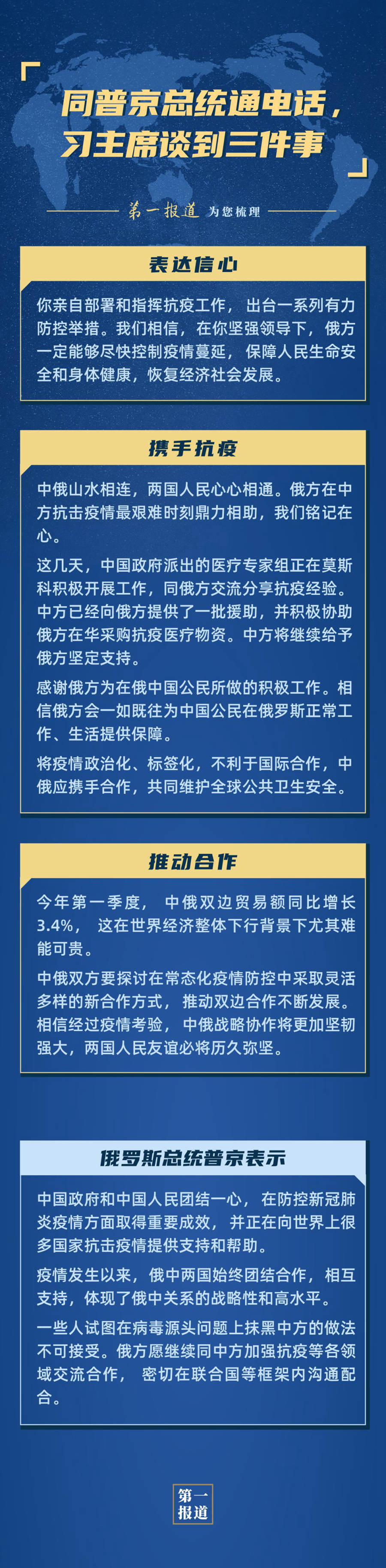 习近平指出,当前,新冠肺炎疫情在全球蔓延,各国都面临抗击疫情的艰巨任务。我们一个月里两次通电话,就更好开展疫情防控合作交流协调,再次体现了中俄关系的高水平。你亲自部署和指挥抗疫工作,出台一系列有力防控举措。我们相信,在你坚强领导下,俄方一定能够尽快控制疫情蔓延,保障人民生命安全和身体健康,恢复经济社会发展。