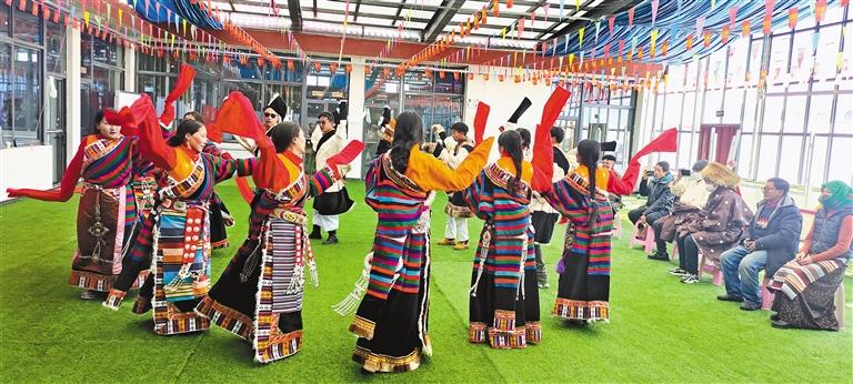 欢度新春佳节、祝福国泰民安,2月1日,安多县扎仁镇再松村驻村工作队联合村“两委”班子与群众欢聚一堂,村文艺演出队还为大家带来了喜闻乐见的文艺表演。 图为再松村群众身着节日盛装,载歌载舞欢度佳节。驻再松村工作队供图