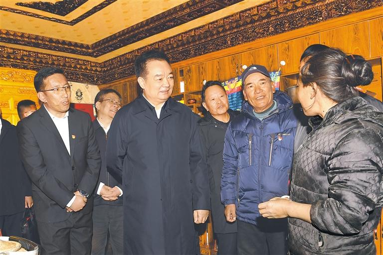 3月17日至19日,自治区党委书记王君正前往山南市深入宣讲全国两会精神并调研。这是王君正在琼结县昌嘎村村民白玛拉吉家中,详细询问生产生活情况。本报记者 李洲 摄